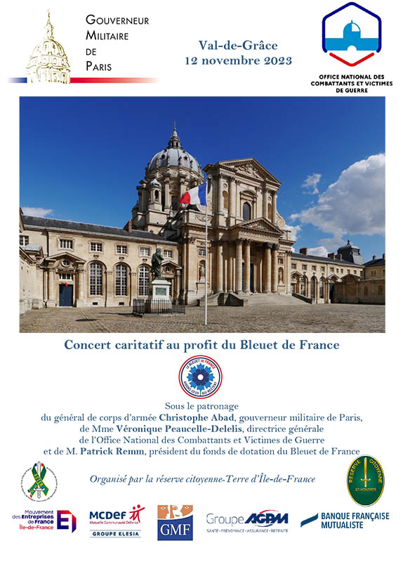 Ce concert est organisé sous le patronage du général de corps d’armée Christophe Abad, gouverneur militaire de Paris, de Mme Véronique Peaucelle-Delelis, directrice générale de l’Office national des combattants et des victimes de guerre et de M. Patrick Remm, président du fonds de dotation du Bleuet de France.