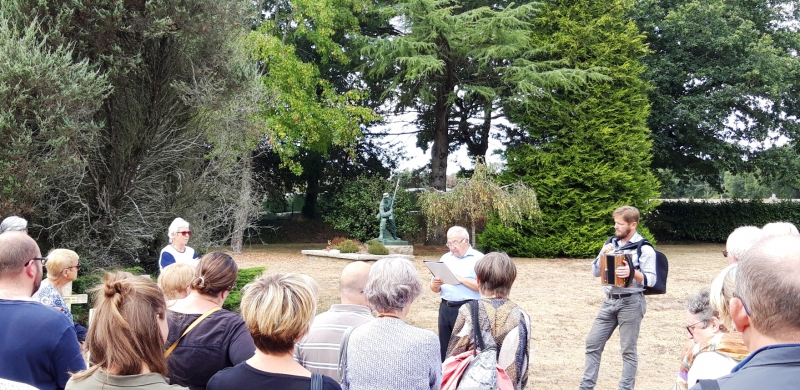 Afin de marquer le centenaire, une visite spéciale d’une heure a été réalisée en début d’après-midi. Les visiteurs ont découvert la Première Guerre mondiale en cinq arrêts entrecoupés d’extraits musicaux et de lectures de lettres d’un poilu morbihannais : Louis Henrio. L’accordéoniste M. Le Hénanff et le conteur M. Carré ont adapté une partie de leur spectacle « Et nos abeilles… » réalisé autour de la correspondance entre Louis et sa femme.