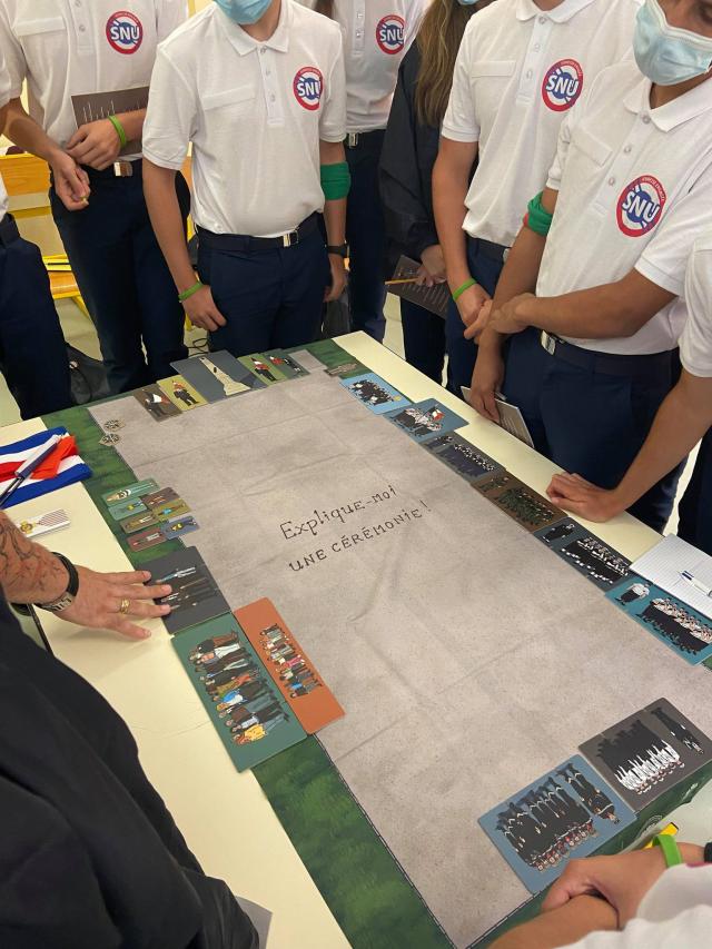 Ensuite, les volontaires ont été initiés à l’organisation d’une cérémonie patriotique, par l’intermédiaire de la mallette pédagogique « Explique-moi une cérémonie ». Celle-ci permet d’expliquer le rôle de chaque participant : du préfet au porte-drapeau, en passant par le récipiendaire militaire. Les volontaires ont redécouvert les acteurs d’une cérémonie ainsi que leurs missions dans la vie de tous les jours.