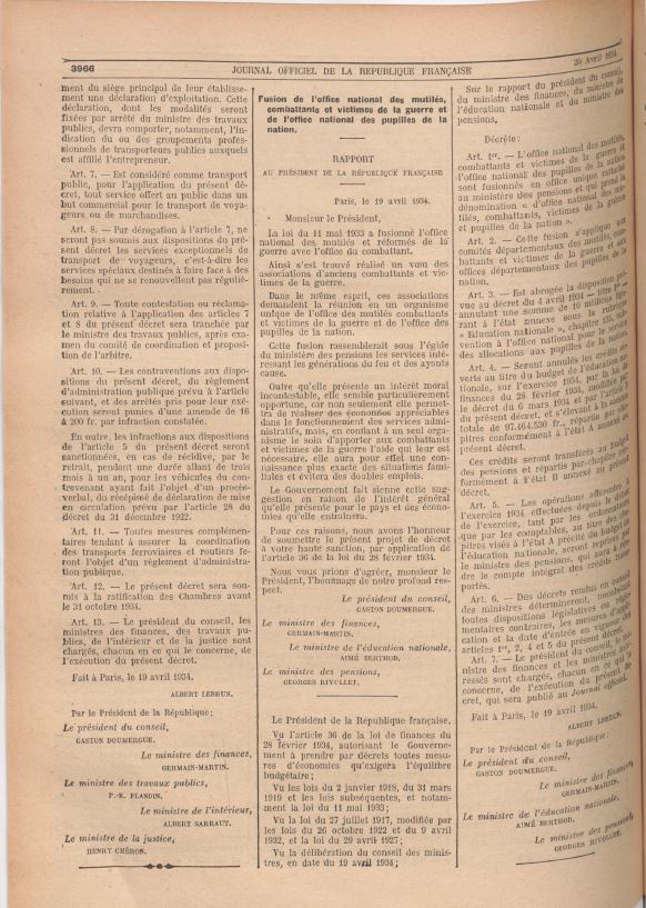 Archive #1 - Décret 19 avril 1934 portant fusion de l'Office national des mutilés, combattants et victimes de guerre